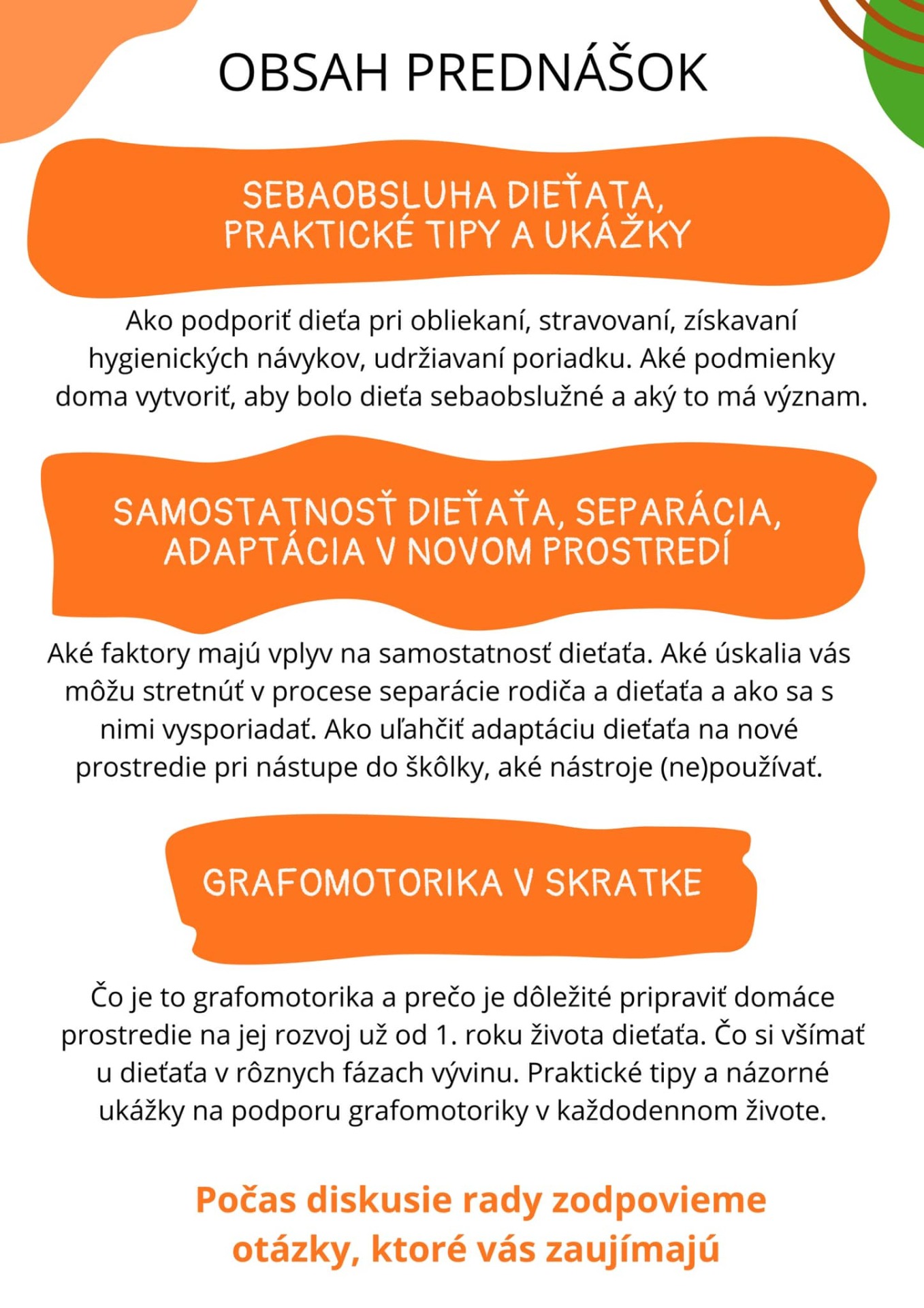 Milí rodičia, chceli by ste podporiť rozvoj vášho dieťatka v domácom prostredí a zišla by sa vám inšpirácia či pomoc? Rady sa s vami podelíme o naše vedomosti a skúsenosti z praxe k témam sebaobsluhy a samostatnosti detí vo veku od 1,5 roka a tiež grafomotoriky, ktoré môžete ihneď aplikovať . Prednášky sa budú konať v Komunitnom centre TEHLIČKA najbližšie tri týždne vždy vo štvrtok od 17:00 do 18:30.